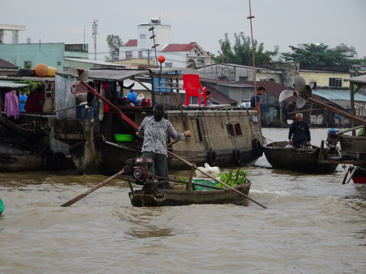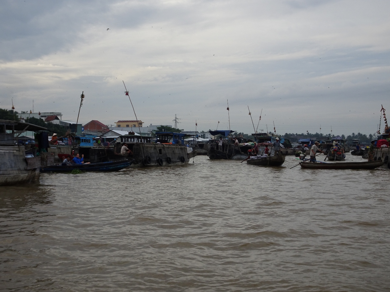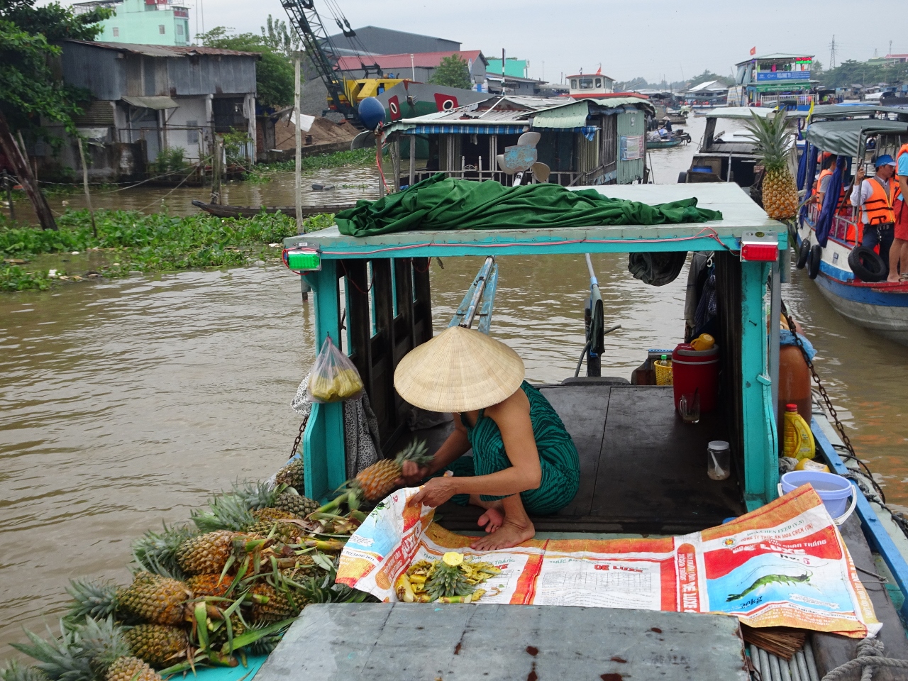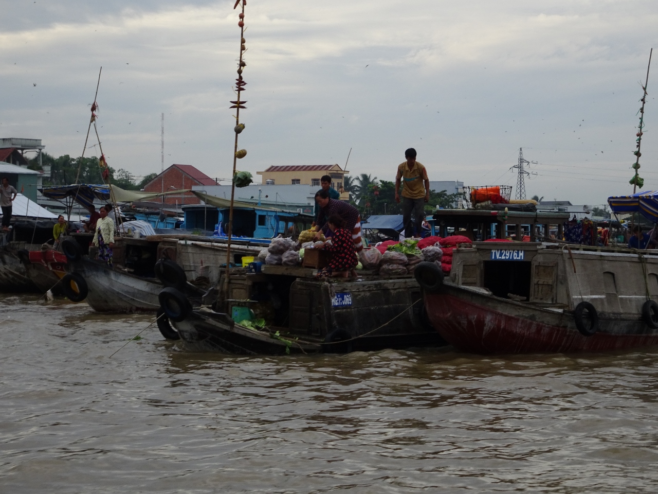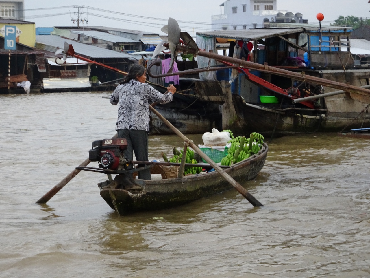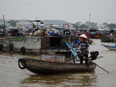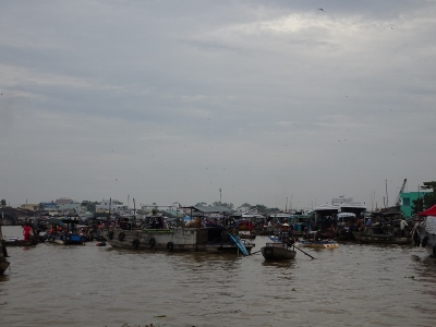 Wir fahren den Song Can Tho, also den Con Tho River, einen Zufluss des Mekong stromaufwärts entlang, bis weit in die Vorstädte von Can Tho. Nach etwa einer dreiviertel Stunde erreichen wir den schwimmenden Marktplatz. Bauern und Händler aus der nahen und weiteren Umgebung kommen hierher und verkaufen ihre Waren, allen voran Obst und Gemüse direkt von den Lastkähnen aus. An jedem Kahn sind an einer langen Stange die angebotenen Produkte angebunden. Händler mit kleinen Booten kommen zu den Lastkähnen und kaufen die Waren ab und verkaufen den Bootlern im Gegenzug, was auf dem Lande nicht zu haben ist.