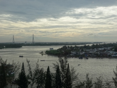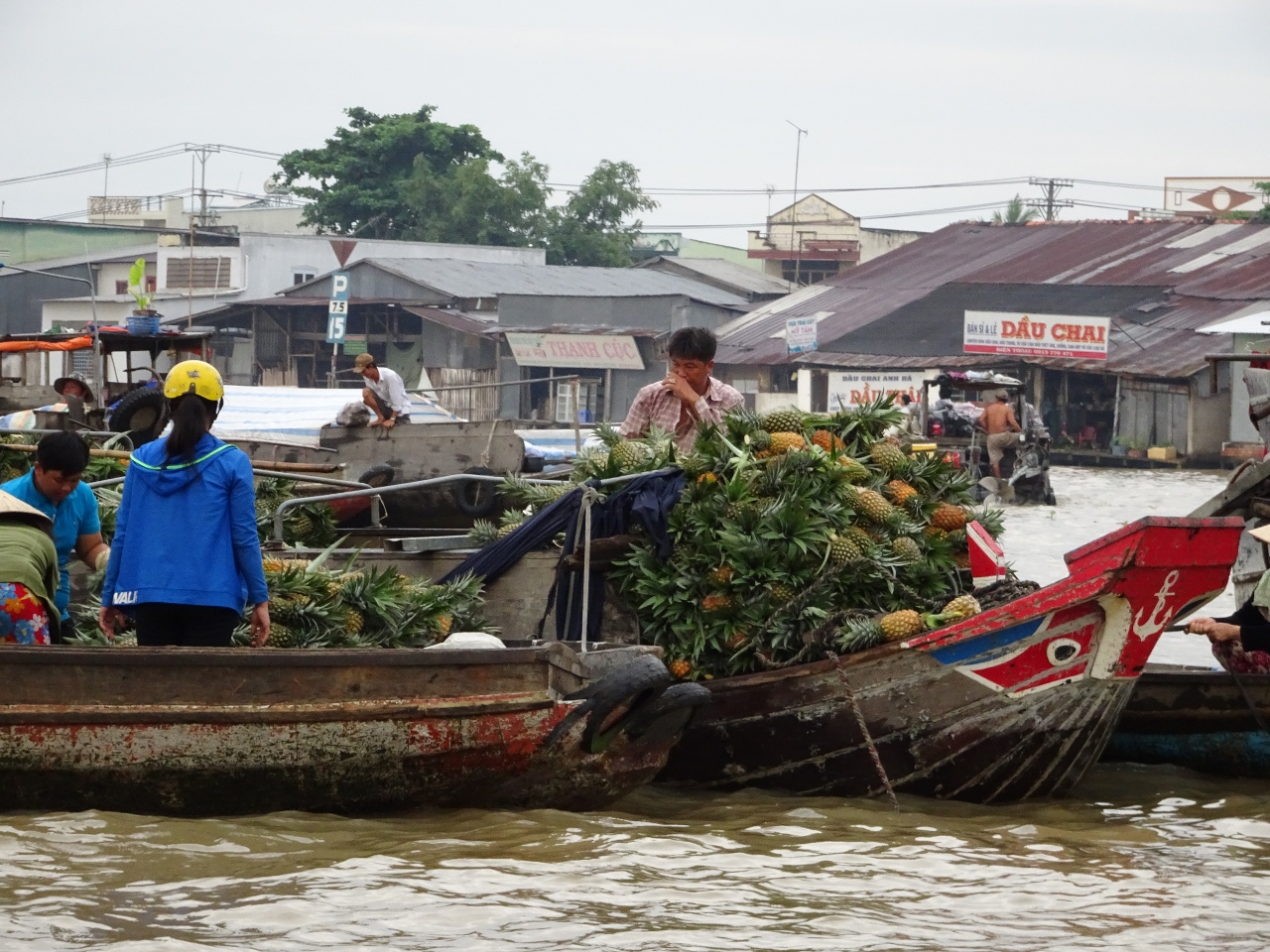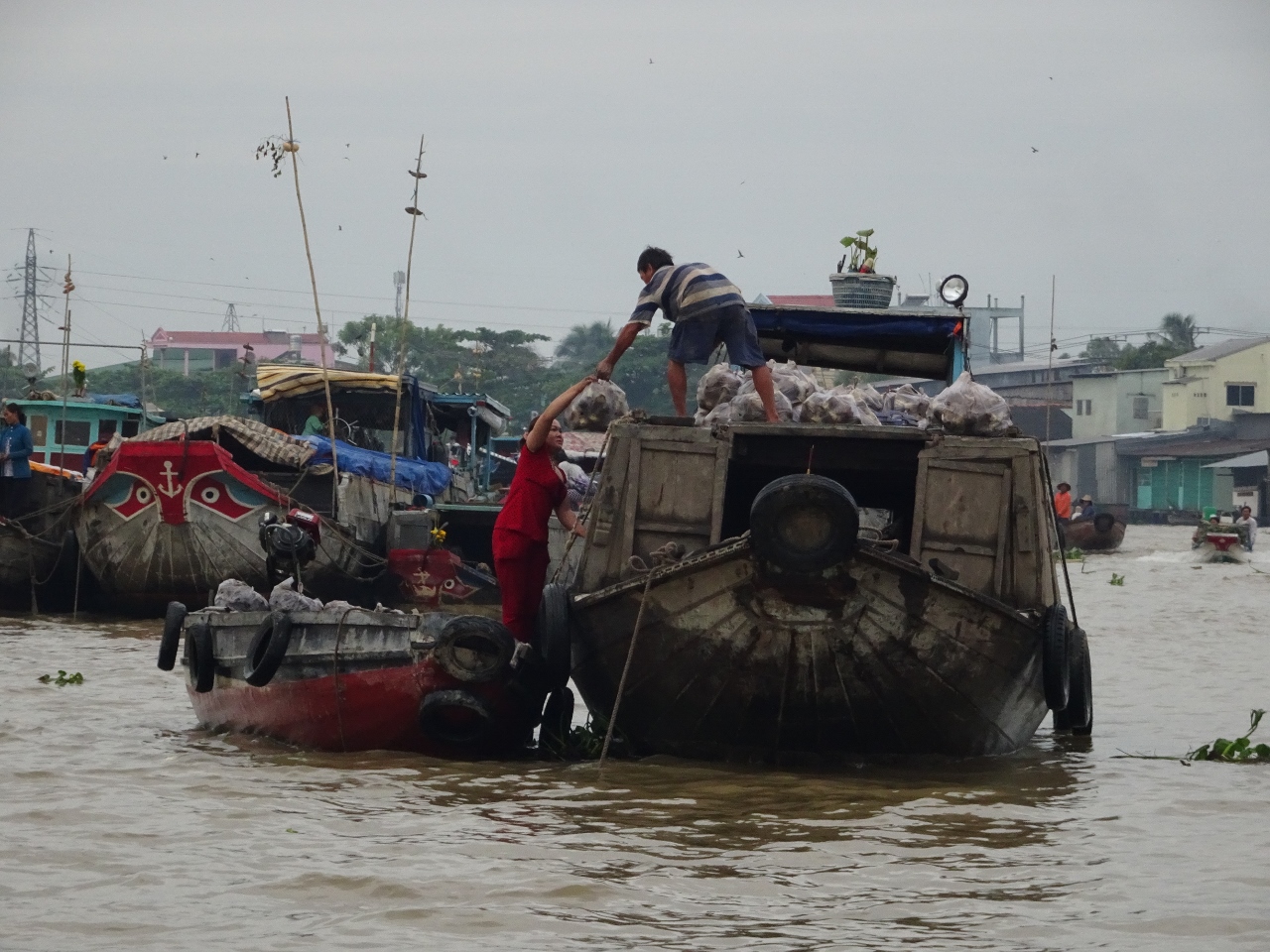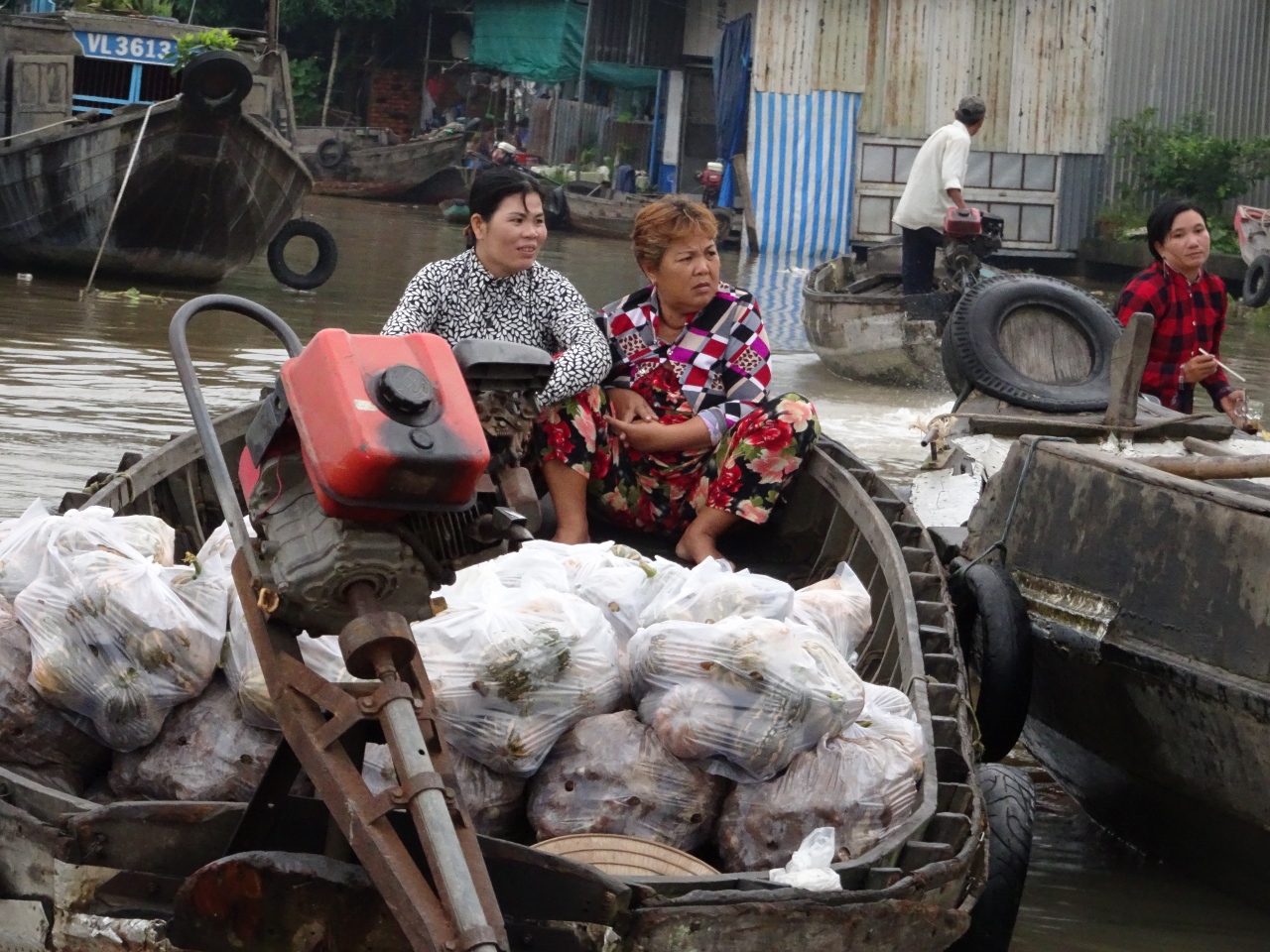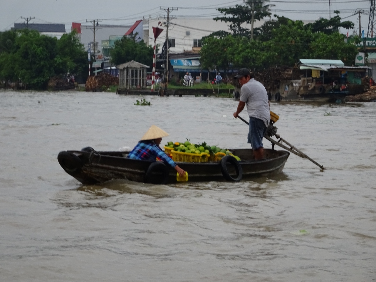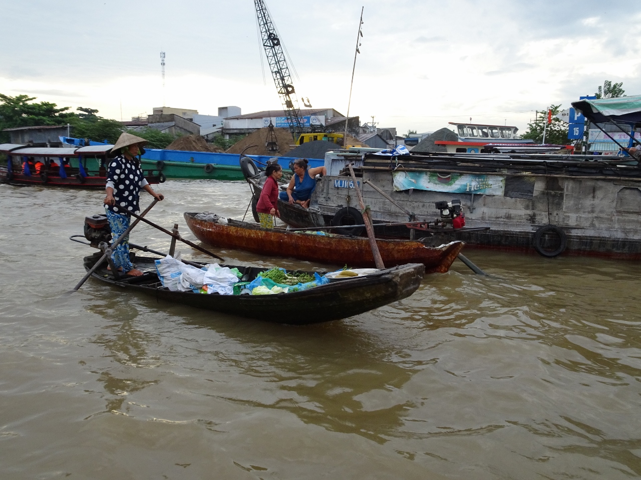 Wir fahren den Song Can Tho, also den Con Tho River, einen Zufluss des Mekong stromaufwärts entlang, bis weit in die Vorstädte von Can Tho. Nach etwa einer dreiviertel Stunde erreichen wir den schwimmenden Marktplatz. Bauern und Händler aus der nahen und weiteren Umgebung kommen hierher und verkaufen ihre Waren, allen voran Obst und Gemüse direkt von den Lastkähnen aus. An jedem Kahn sind an einer langen Stange die angebotenen Produkte angebunden. Händler mit kleinen Booten kommen zu den Lastkähnen und kaufen die Waren ab und verkaufen den Bootlern im Gegenzug, was auf dem Lande nicht zu haben ist.