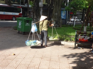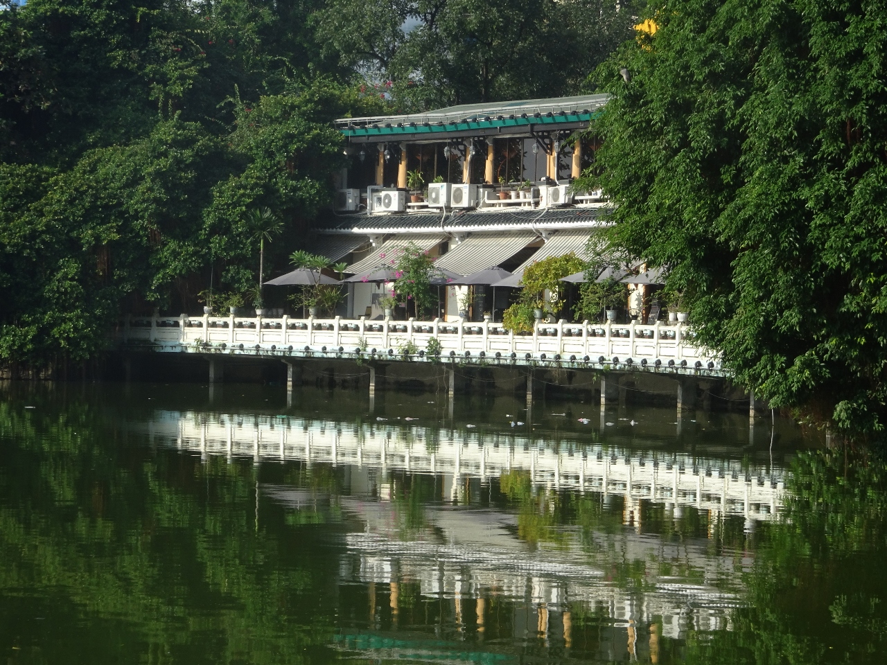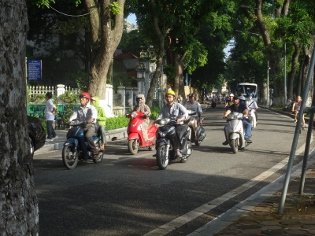Es ist jetzt viertel vor acht und wir drehen zuerst eine Runde um den See. Die Wolkendecke hat aufgerissen, die Sonne kommt durch, aber überall stehen große Pfützen, es hat wohl kurz zuvor ziemlich geschüttet, normal hier. Die Luft ist sehr diesig, wober ein Großteil davon wohl auf den Smog zurückzuführen ist, die Luft ist abgasgeschwängert, viele Vietnamesen fahren daher auch mit Atemschutz auf dem Mopped. Während unserer Runde um den See sehen wir unzählige, meist ältere Leute bei ihren Gymnastikübungen, mal mit Musik, mal ohne. Die skurilste Vorstellung ist aber eine Art Tanzveranstaltung, so richtig mit DJ und etlichen Päärchen, mal Männlein und Weiblein, aber auch zwei ältere Mädels miteinander, die so richtig am Tanzen sind, wohlgemerkt früh morgens kurz nach acht!