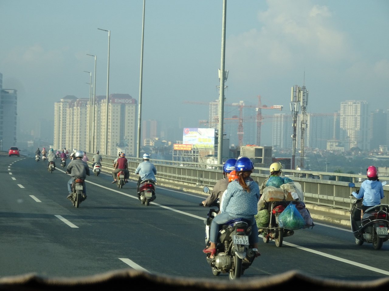 Wie wir vom anderen Schwätzer bereits erfahren hatten (war er also doch nicht vollkommen nutzlos), liegt der Flughafen sehr weit außerhalb der Stadt, es sind ca. 45 km bis zu unserem Hotel. Wir fahren zunächst auf einer Schnellstraße entlang von Feldern und kleinen Ortschaften. Wir schauen gespannt aus den Fenstern, wie viele verschiedene Gesichter die Welt doch hat... Bereits hier fallen uns die unzähligen Mopeds auf, es gibt auf der Schnellstraße eine extra Spur für diese, aber die reicht bei weitem nicht aus. Ich glaube, alle verfügbaren Vietnamesen sind jetzt hier auf dieser Straße unterwegs. Richtig krass wird die Vorstellung, als unser Fahrer von der Schnellstraße auf eine deutlich weniger breite Einfallstraße abbiegt und hier wächst mir die Nummer dann über den Kopf. Der Füllgrad dieser Straße hat den Anschein, als wenn jemand den Inhalt einer Badewanne versucht in einen Zehn-Liter-Eimer zu pressen. Es wuseln Millionen Moppeds um uns und den restlichen Rush-Hour-Verkehr rum (nicht vergessen, es ist sieben Uhr morgens), dazwischen Radfahrer, Fußgänger und immer wieder Geisterfahrer, laut hupend, aber das gehört hier anscheinend so, keiner beschwert sich drüber.