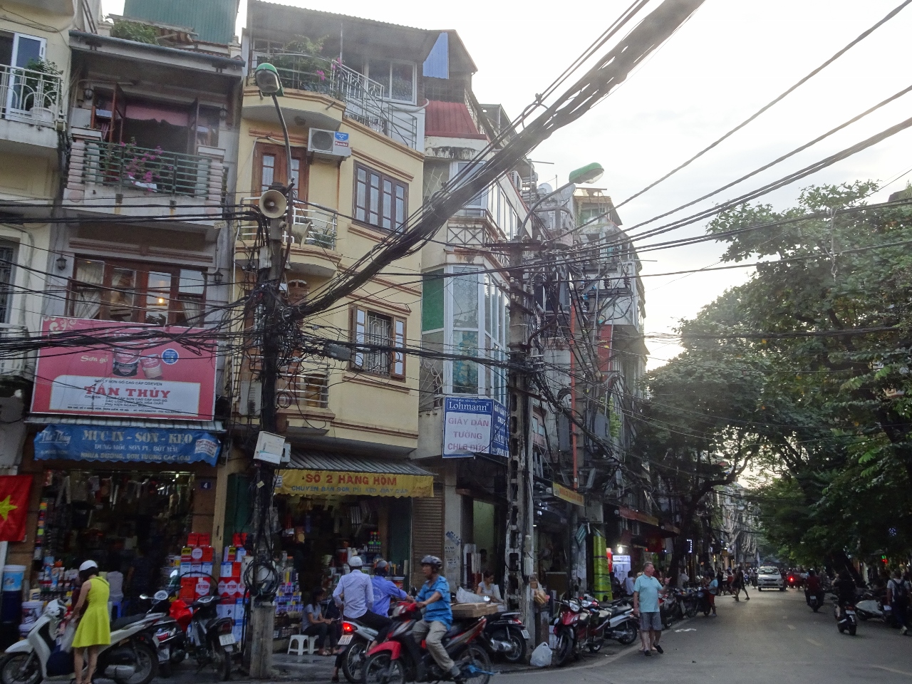 Die Architektur dieser Stadt ist gar nicht richtig zu beschreiben, es gibt ein paar Hochhäuser aber rundherum gibt es von feudalen Großstadtvillen, sowohl im asiatischen, als auch im französischen Stil, über kleine Stadthäuser bis hin zu vollkommen verfallenen Baracken alles, in jeglich erdenklichen Erhaltungszustand. Beachtlich ist auch die Elektoinstallation, da ist man ja einiges gewohnt aus Europas südlichen Ländern, aber sowas wie hier hab ich noch nie gesehen. Auf jeden Fall entspricht das hier keinesfalls meiner Vorstellung einer Großstadt und Ha Noi hat beachtliche 7,5 Millionen Einwohner. Aber es macht mir ja bekanntlich Spaß in solchen Städten rumzulaufen und die Eindrücke aufzusaugen. Nur an die Moppeds muss ich mich erst noch gewöhnen, noch hab ich das nicht ganz drin im Verkehr hier mitzuschwimmen.
