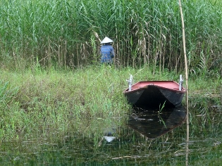 Fischern oder Bauern, die Schilf schneiden, das alles schaut