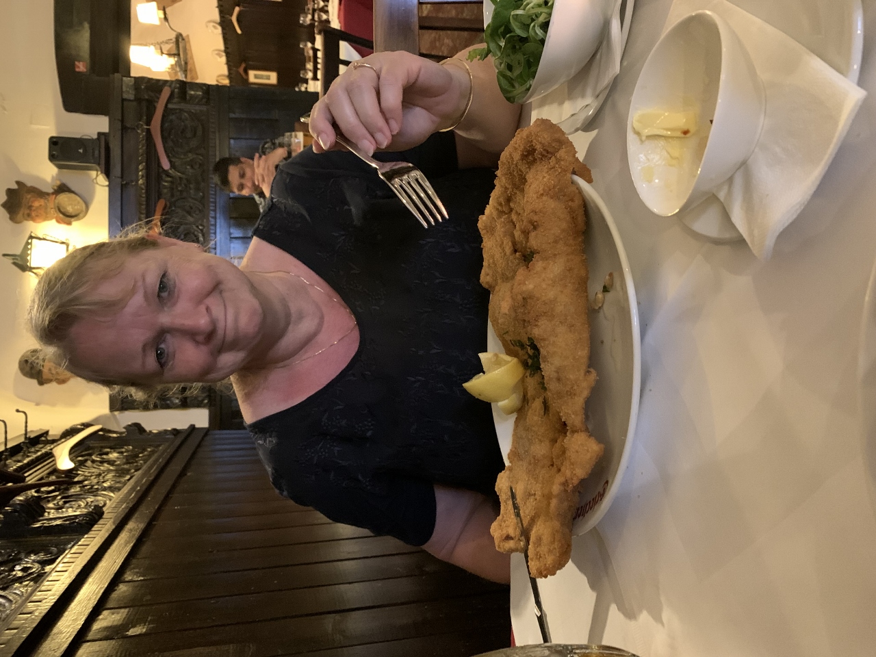 Es gibt Schnitzel; köstlich, aber so groß, dass es nicht