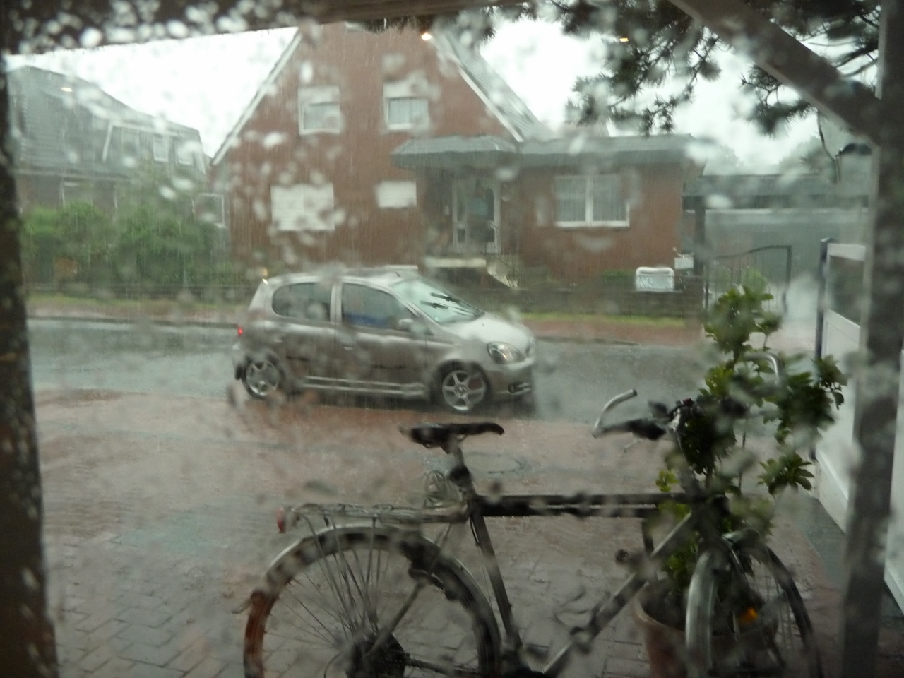 Minuten steht das Wasser zentimeterhoch auf der Straße. Wären wir da drin gewesen hätten wir doch noch ein Bad genommen. Wir wären bis auf die Unterhose