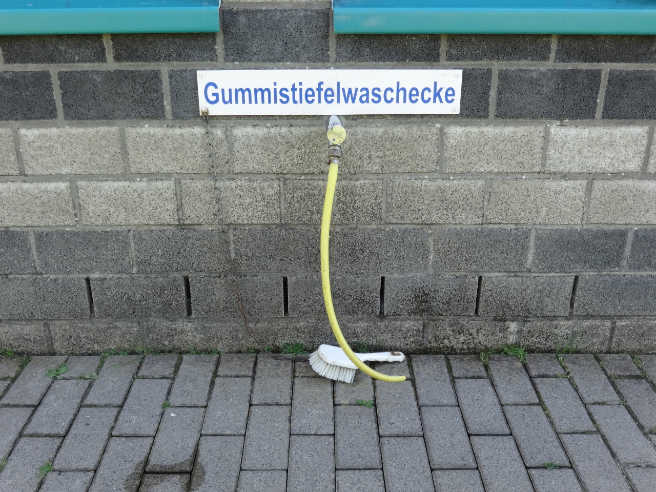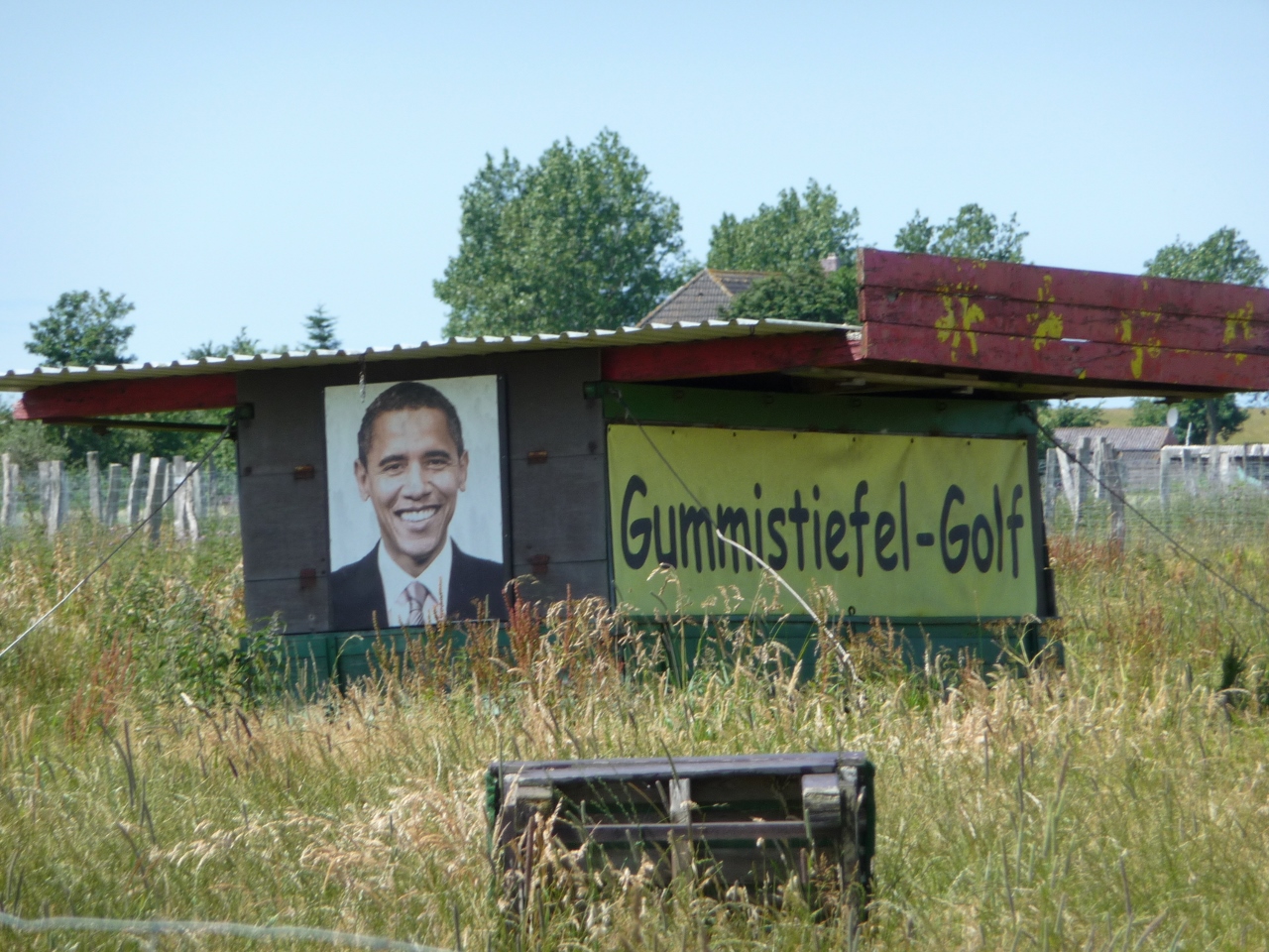 auf einem Feld wir die Trendsportart “Gummistiefelgolf” beworben. Dabei geht es darum, auf einem ganz wüsten Acker, zwischen bis zu