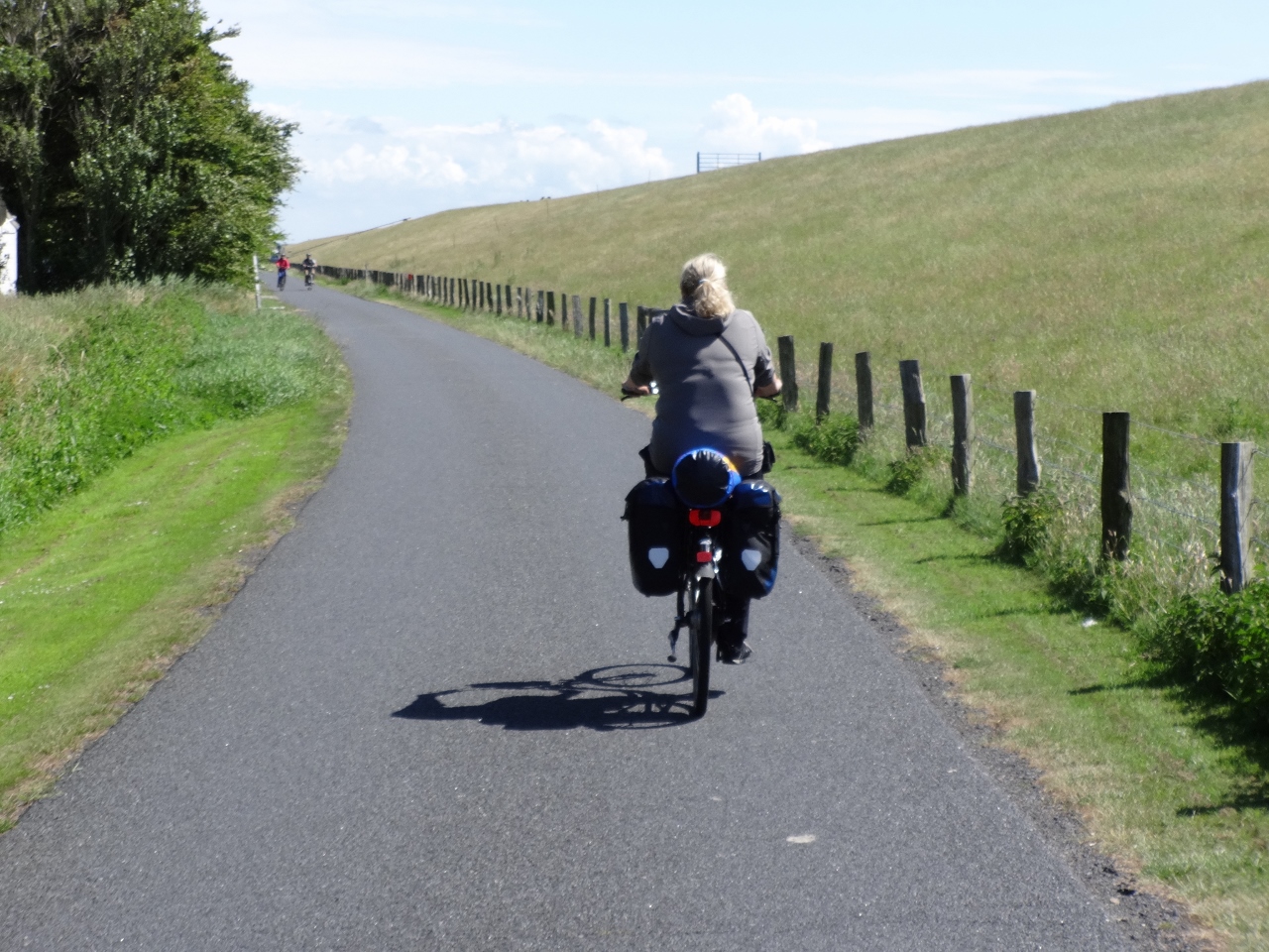 schiebt auch kräftig von hinten, alles gut bis jetzt. Der Weg führt uns immer am Deich entlang. wir fahren außendeichs, also auf der Wasserseite.