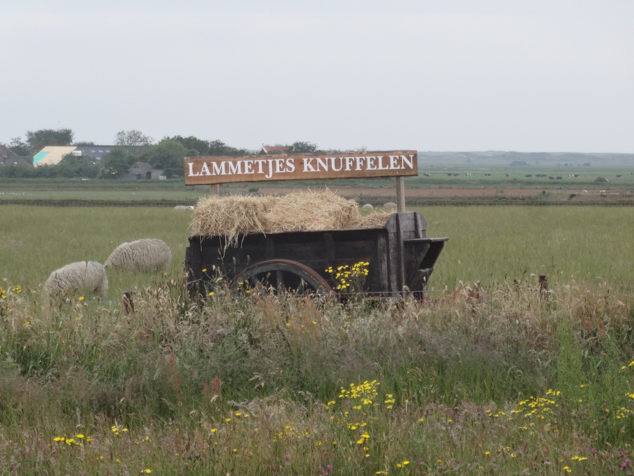 Nicht prikelnd, aber zu gucken, gab es auch was. Auf der linken Straßenseite wies ein Schild zunächst darauf hin, dass man dort Lammetjes knuffelen kann (wir nehmen